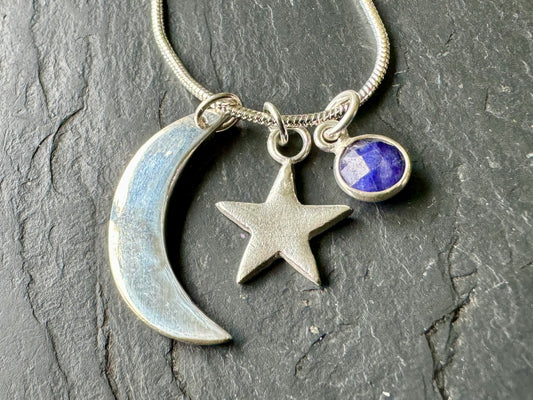Handmade silver moon, star and gem necklace