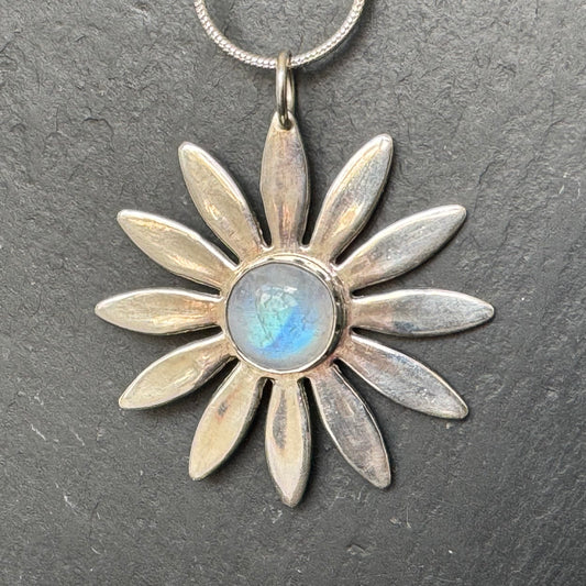 Silver daisy with moonstone pendant necklace