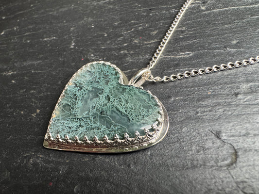 Handmade Silver and Lichen Moss Agate Heart Pendant