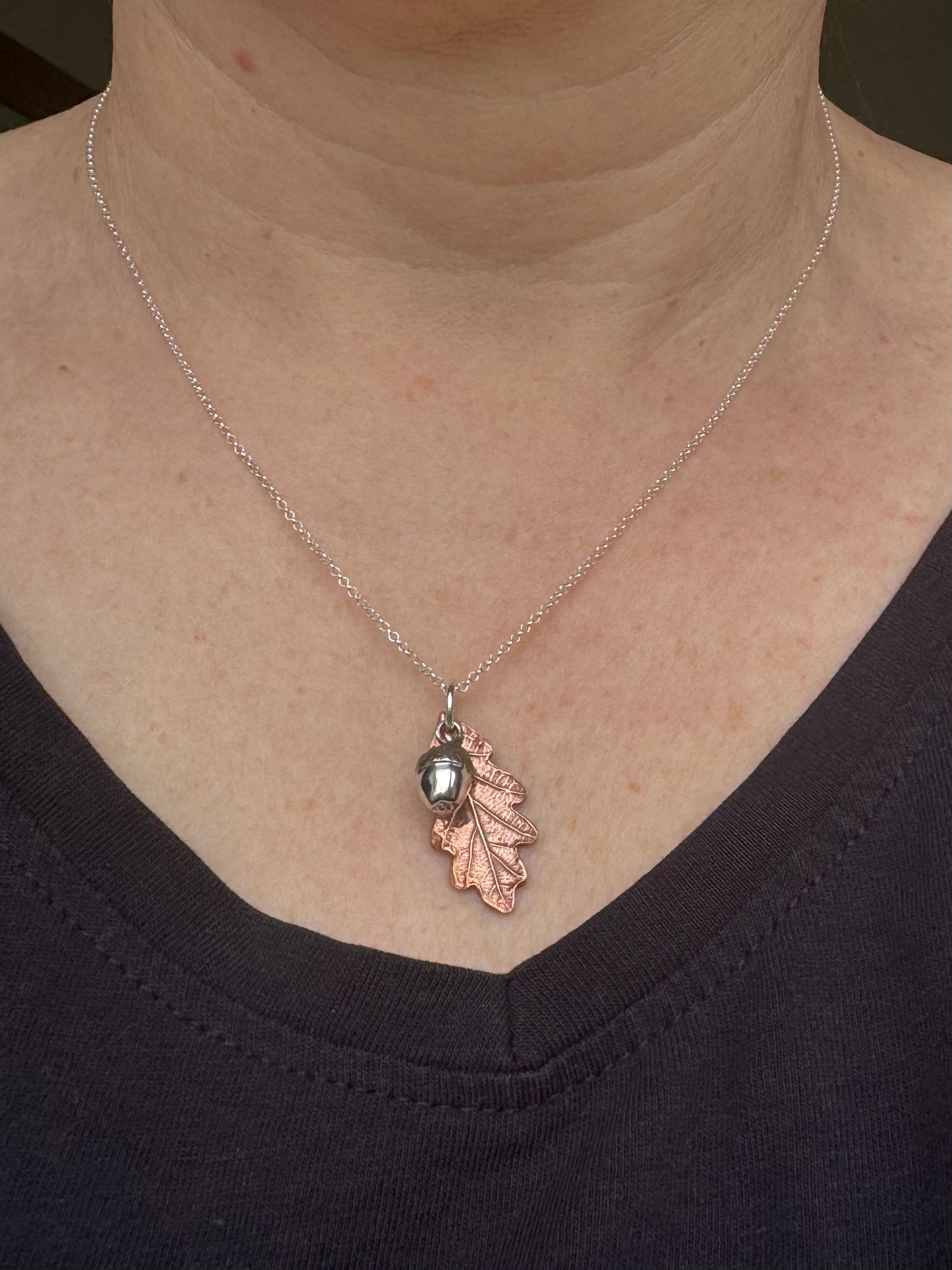 This handmade piece gives the autumnal feel of the copper leaf contrasting with the solid sterling silver acorn. The perfect pair! Created using recycled silver and copper, modelled on a real leaf and tiny acorn!