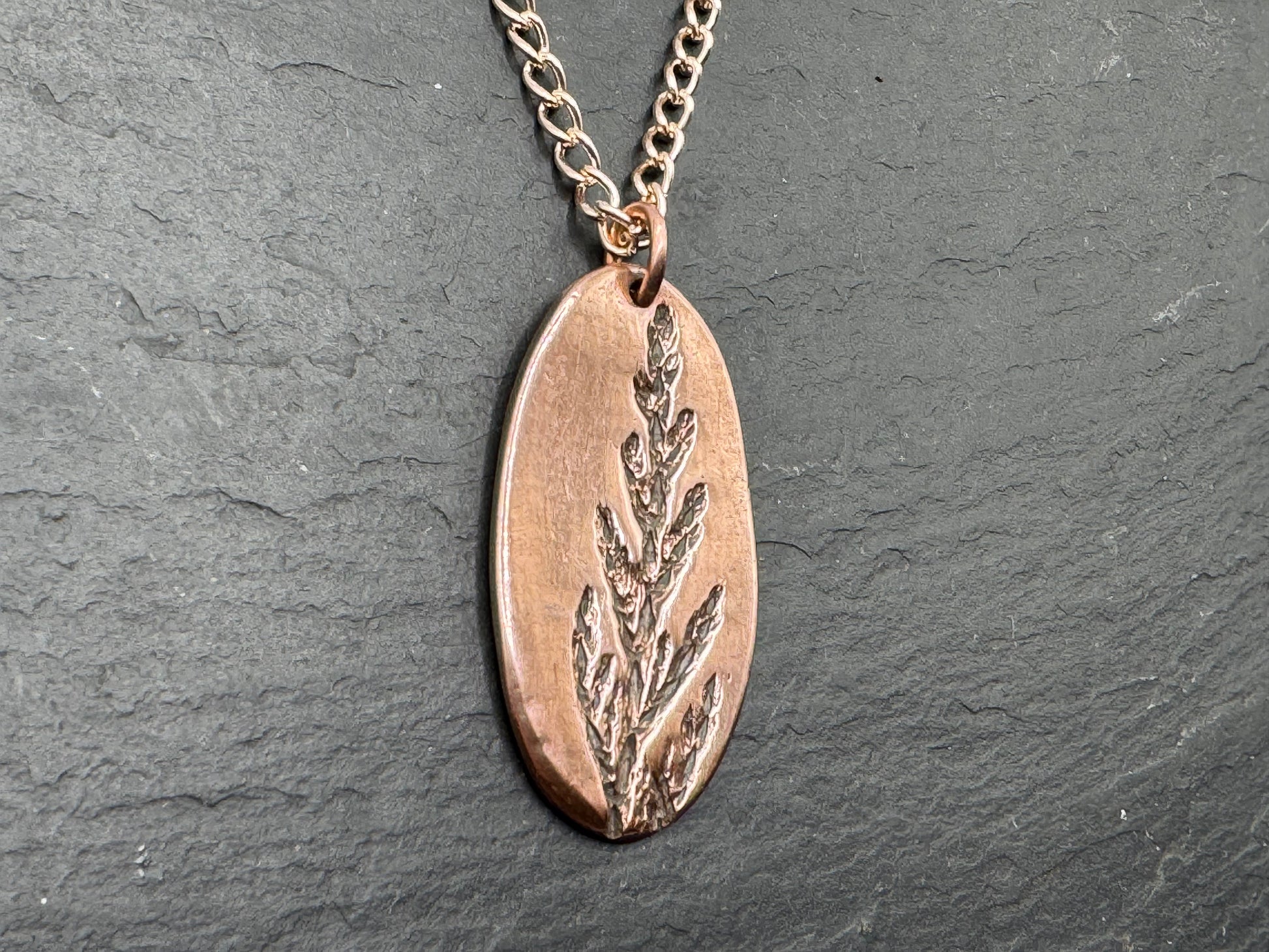 A pendant with rich warm tones of copper with the evergreen imprint detailing. The pendant is handmade from recycled copper and supplied with a rose gold plated 18 inch chain. As each one is made individually, slight variation will occur.