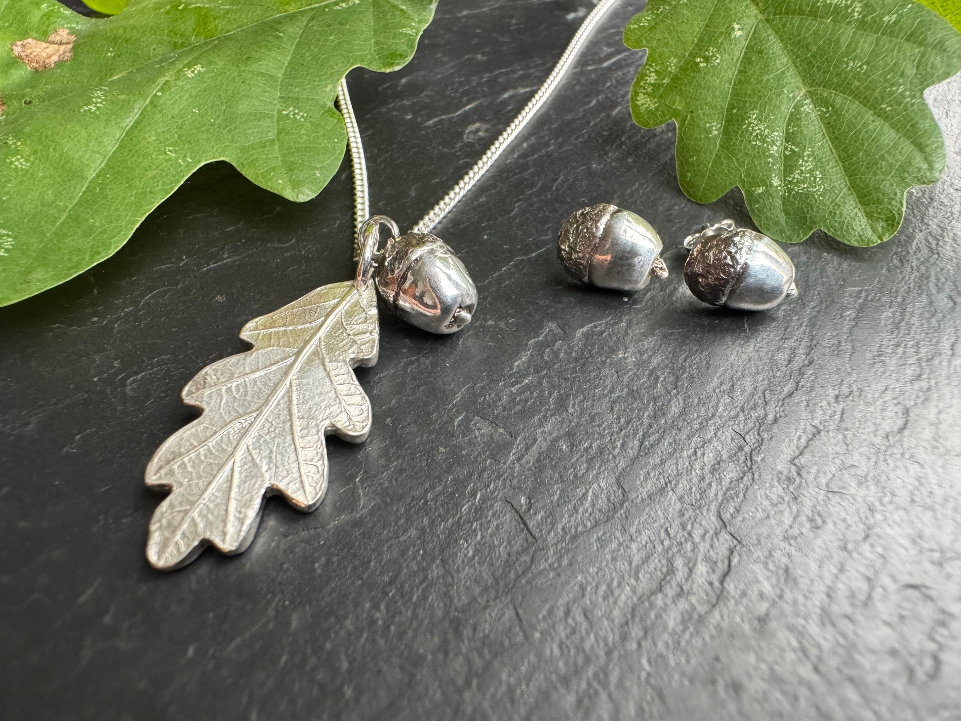 Handmade from a perfect tiny acorn and my baby oak leaf, this duo sit perfectly together. Transformed with all its detail from nature into solid recycled silver jewellery. Simple and timeless designs on an 18 inch sterling silver chain.